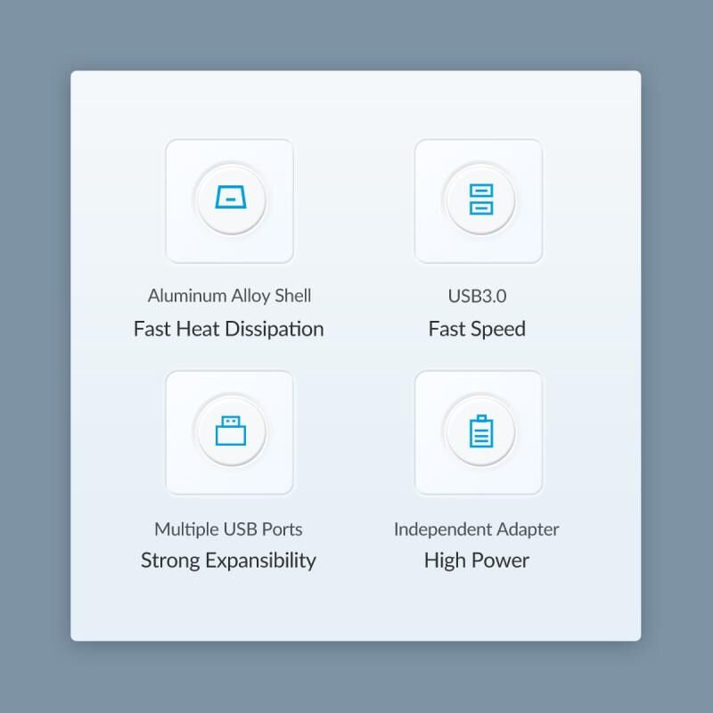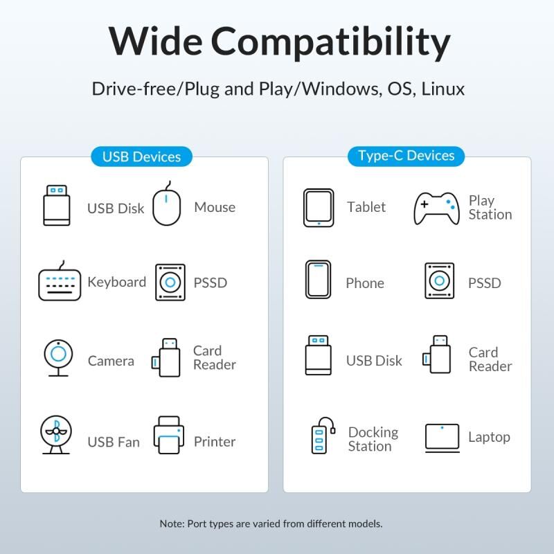4. 5V 2A Power Supply Interface: ORICO USB 3.2 aluminum Hub reserved USB-C 5V power supply interface, can be external 5V 2A power supply sufficient to ensure the normal operation of high-power USB devices; (This product package does not include the power adapter) Support hot-plug, no driver.