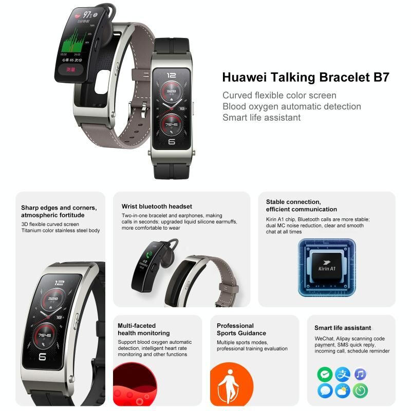 5. The Huawei TalkBand B7 is powered by the brands Kirin A1 processor. It is compatible with HarmonyOS 2.0+, Android 7+, and iOS 9.0 and above. The device packs convenient features like quick reply, camera and music control, Alipay quick payment, WeChat, and more. The TalkBand B7 is backed by a 120mAh battery unit that can be topped up via a USB-C port.