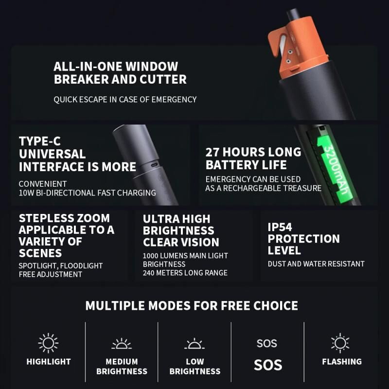 5. Λειτουργία σταθερού φωτισμού τριών ταχυτήτων, εναλλαγή 1000 lumens / 400 lumens / 40 lumens διαδοχικά