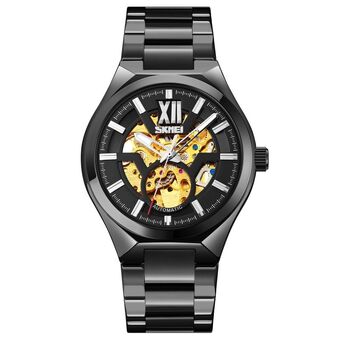 SKMEI 9258 Men Two-color Stainless Steel Strap Automatic Mechanical Watch(Black Shell Black Surface) (SKMEI)
