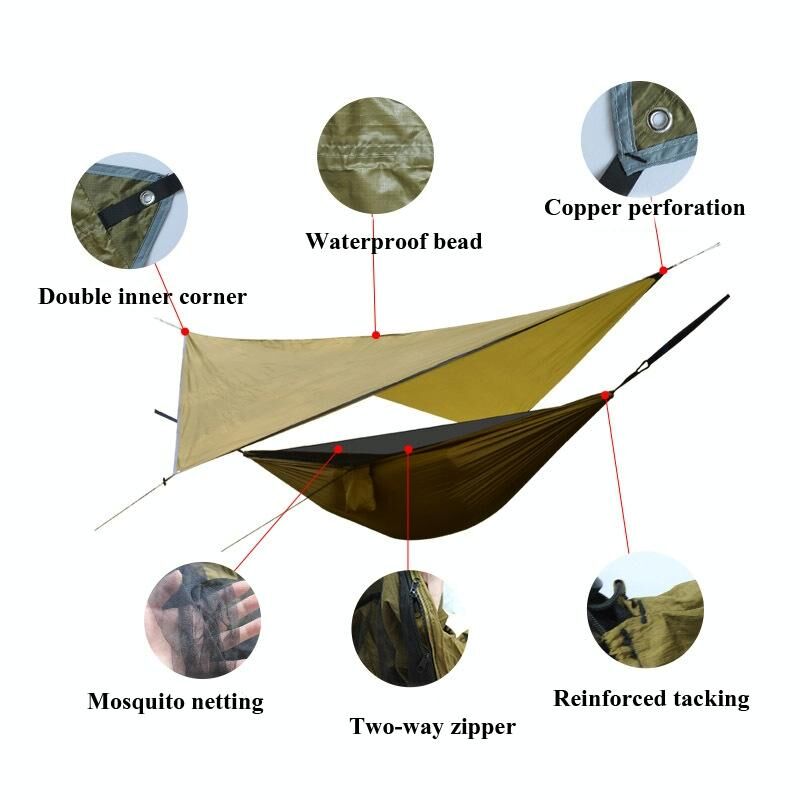 4. Αξεσουάρ: σχοινί υψηλής αντοχής 2m x 2, σχοινί έλξης κουνουπιέρας 3,6m x 2, μαύρη πόρπη 8cm x 2, καρφί δαπέδου αλουμινίου x 2, τσάντα αποθήκευσης αιώρας x 1