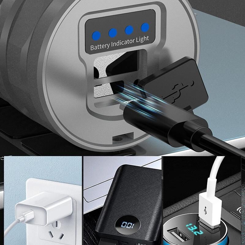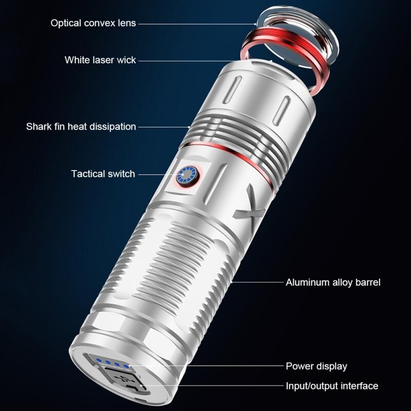 Χαρακτηριστικά: 1. Συγκεντρωμένο φως και μεγάλη εμβέλεια, λευκή λάμπα laser 2. Λάμπα LED υψηλής ισχύος, φωτεινό φως, μεγάλη απόσταση φωτισμού 3. Σύστημα ψύξης πολλαπλών σταδίων "πτερύγιο καρχαρία" για γρήγορη ψύξη του σώματος της λάμπας 4. Τέσσερα επίπεδα ένδειξης μπαταρίας 5. Ευφυής αλλαγή ταχυτήτων, λειτουργία πέντε ταχυτήτων, αδιάβατη ρύθμιση φωτεινότητας 6. Τηλεσκοπικό zoom, ρύθμιση εστίασης και διάχυσης φωτός Παράμετροι προϊόντος: 1. Υλικό: κράμα αλουμινίου 2. Πεδίο εφαρμογής: ορειβασία, περιπολία ασφαλείας, ποδηλασία, κάμπινγκ κ.λπ. 3. Λάμπα: λευκή λάμπα laser 4. Ταχύτητες: δυνατό φως, μέτριο φως, χαμηλό φως, strobe, SOS 5. Ένδειξη μπαταρίας: ένδειξη τεσσάρων επιπέδων με μπλε φως 6. Lumens: 1000 7. Ισχύς: 30W 8. Ρεύμα εξόδου: 5V/1A 9. Ρεύμα λειτουργίας: 3.5A 10. Διεπαφή: Type-C/USB-C 11. Χωρητικότητα μπαταρίας: 4500 mAh 12. Διάρκεια ζωής μπαταρίας: 5 ώρες 13. Χρόνος φόρτισης: 8 ώρες 14. Μέγεθος προϊόντος: 4.7 x 4.7 x 15.2 cm 15. Καθαρό βάρος: 380 γραμμάρια 16. Συσκευασία: κουτί από δέρμα αγελάδας