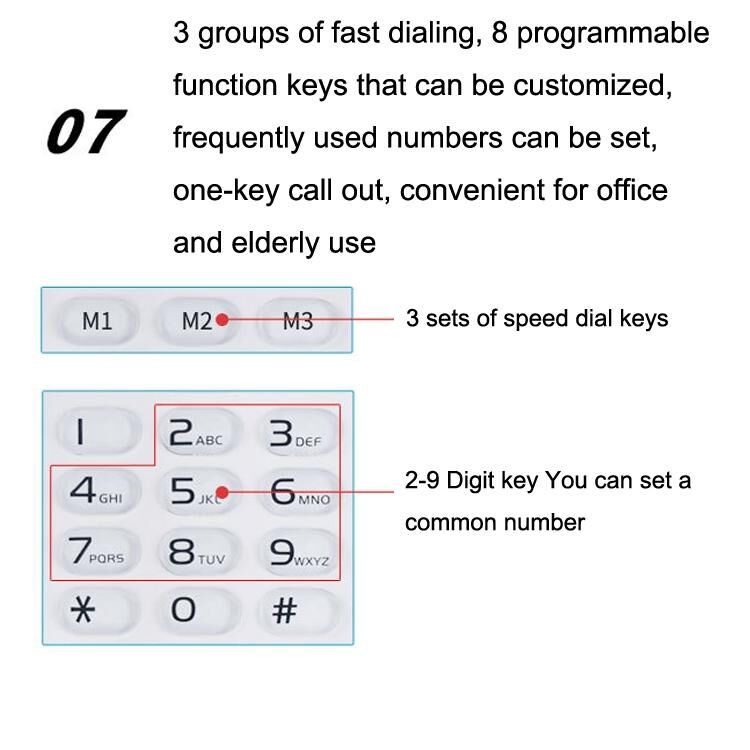 10. 3 groups of fast dialing, 8 programmable function keys that can be customized, frequently used numbers can be set, one-key call out, convenient for office and elderly use