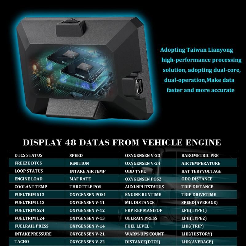 6. Rich Contents: vehicle speed, engine RPM, water temperature, voltage ,instantaneous fuel consumption, average fuel consumption, sum driving distance measurement, driving time, low voltage alarm , high water temperature alarm, over speed alarm, engine fault code alarm, eliminate the fault code, freely switch between kilometers&miles.
