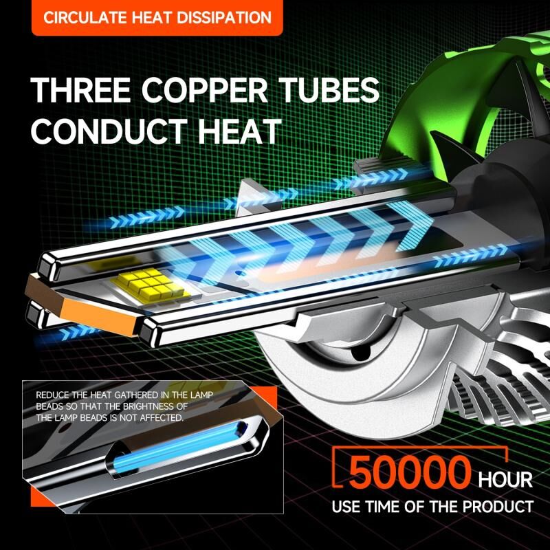 11. Διπλό στρώμα χάλκινου υποστρώματος + ενσωματωμένο σύστημα αγωγιμότητας θερμότητας διπλού χάλκινου σωλήνα, με υδραυλικό ανεμιστήρα, η ταχύτητα μπορεί να φτάσει τις 15000 στροφές/λεπτό, το οποίο μπορεί να διαχέει τη θερμότητα πιο αποτελεσματικά και γρήγορα, καθιστώντας τα φώτα αυτοκινήτου να λειτουργούν πιο σταθερά και αυξάνοντας σημαντικά τη διάρκεια ζωής των φώτων αυτοκινήτου LED, η διάρκεια ζωής μπορεί να φτάσει τις 50000+ ώρες