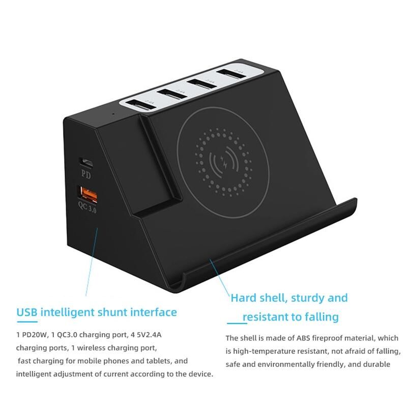 1. Support multi-device charging at the same time, 1 PD20W, 1 QC3.0 charging port, 4 5V 2.4A charging ports, 1 wireless charging