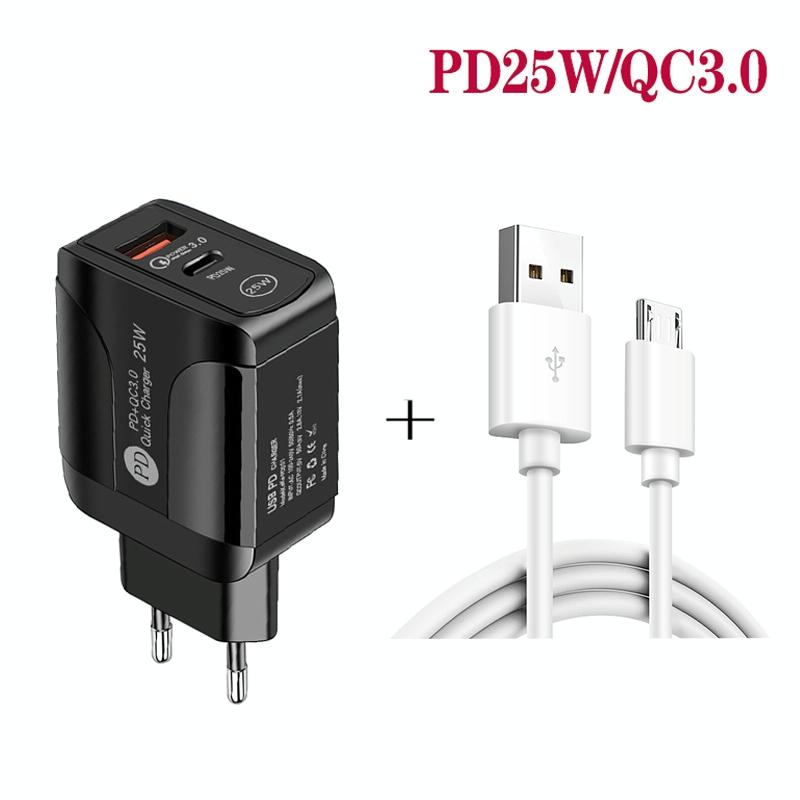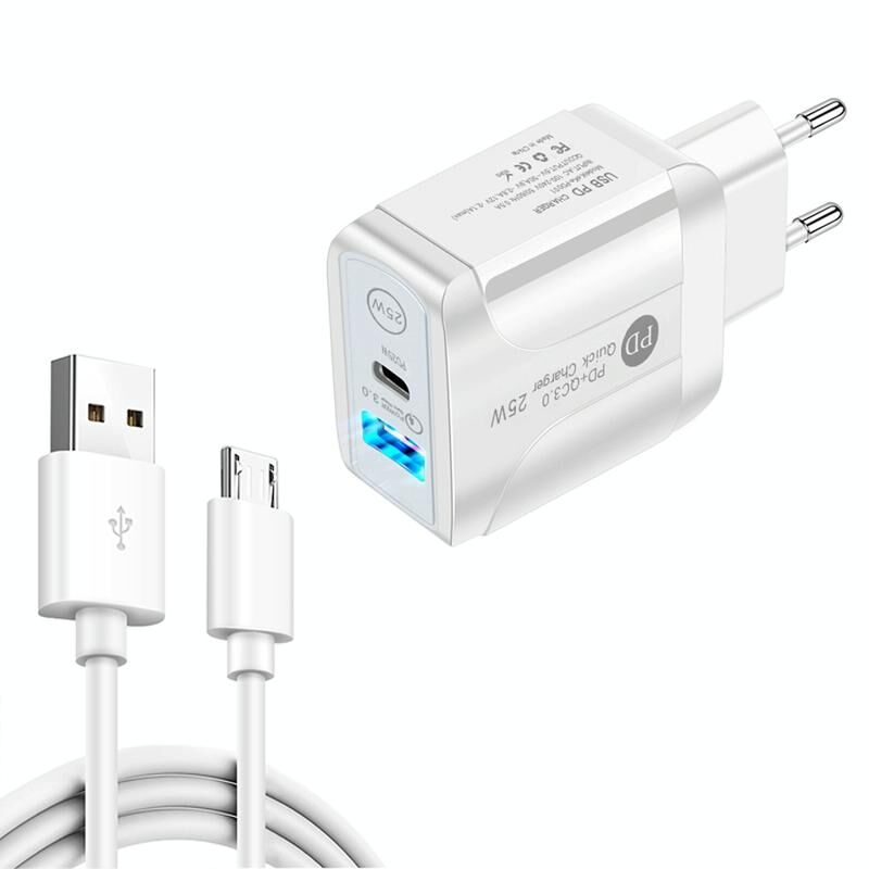 PD25W USB-C / Type-C + QC3.0 USB Dual Ports Fast Charger with USB to Micro USB Data Cable, EU Plug(White)