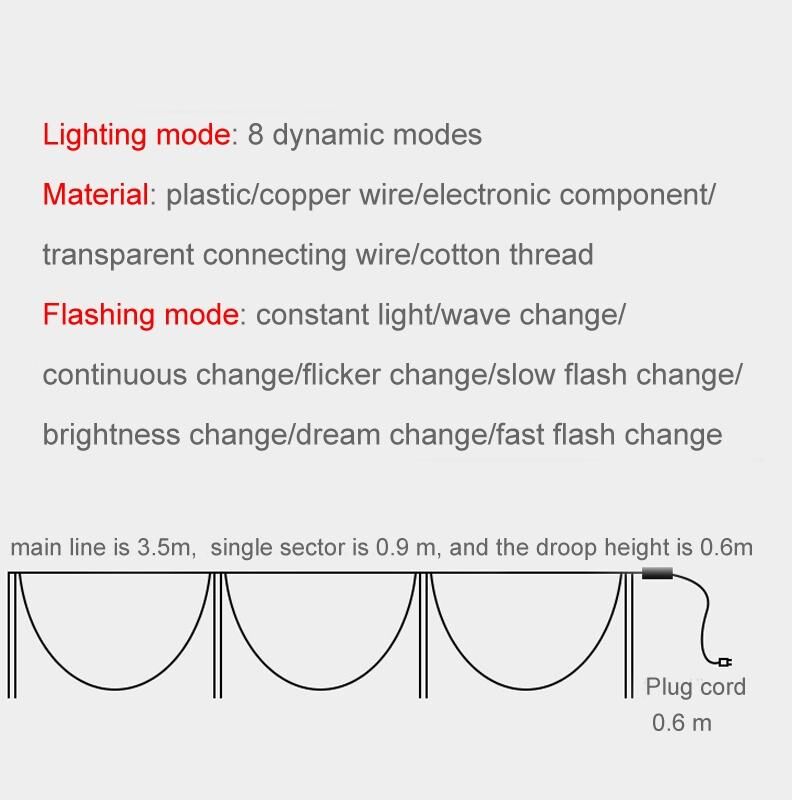 4. Διαστάσεις: κύρια γραμμή 3,5 μέτρα, το μήκος του μεμονωμένου ανεμιστήρα είναι 0,9 μέτρα, το ύψος κρέμασης είναι 0,6 μέτρα, το καλώδιο του βύσματος είναι 0,6 μέτρα