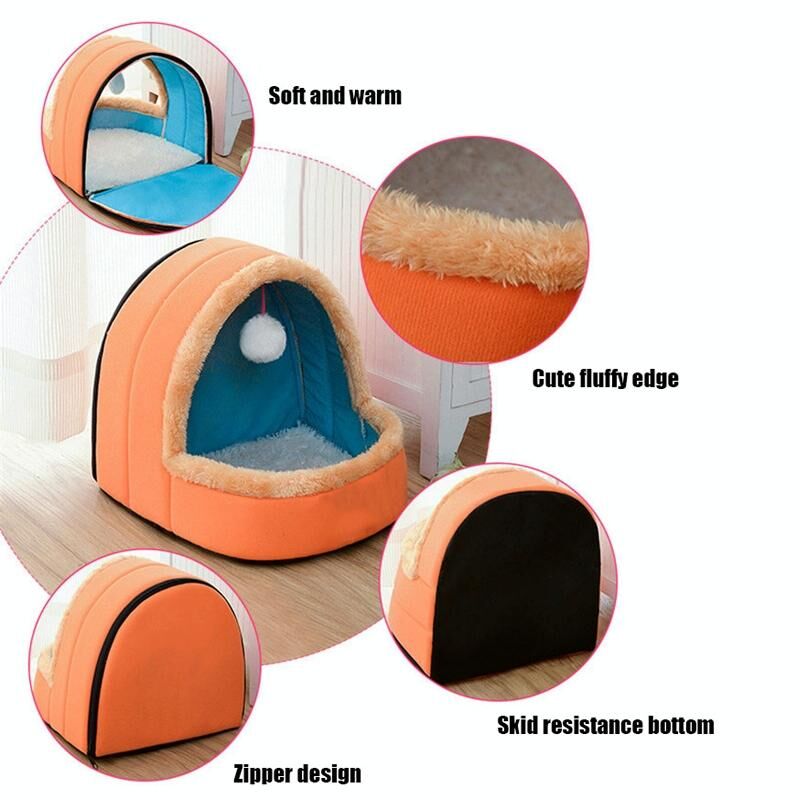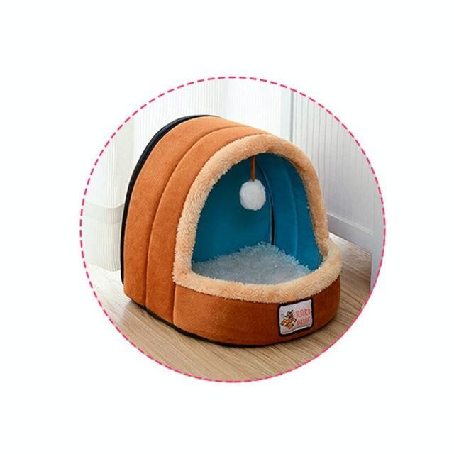 Ζεστή, απαλή κλίνη για κατοικίδια - σκύλο, γάτα, μαξιλάρι για κατοικίδια, σκυλόσπιτο, κάστρο γάτας, πτυσσόμενο σπιτάκι για κουτάβια με μπαλάκι παιχνιδιού, Μέγεθος: Μ (Χρώμα: Καμηλό).