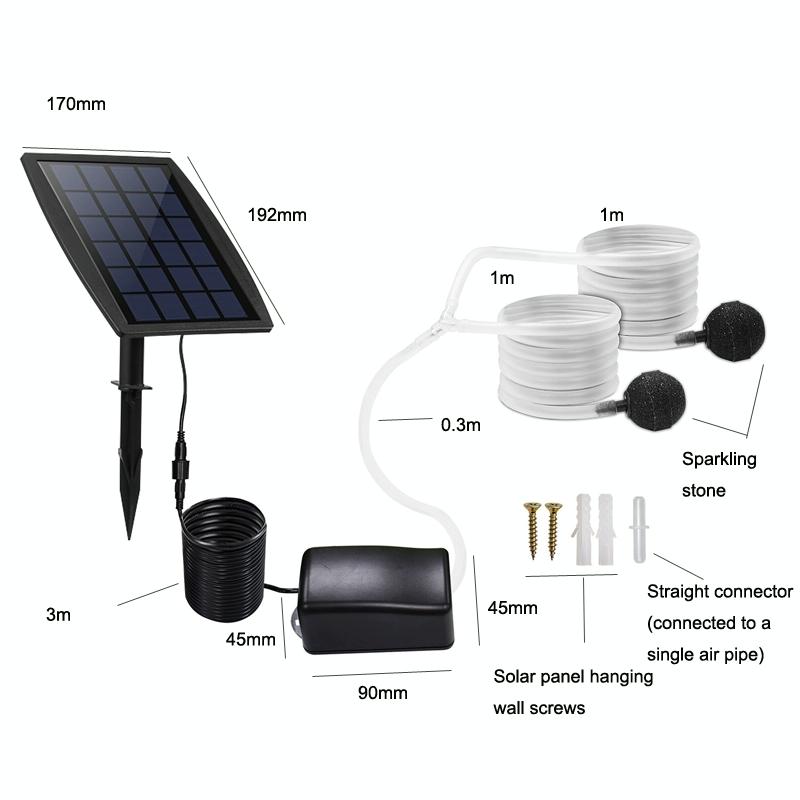Connect the air stone with the vent hole and put it into the water body that needs oxygenation. The solar panel faces the sunlight, and there is no obstruction between the solar panel and the sunlight. Press the POWER switch, and the oxygenation pump will start to work
