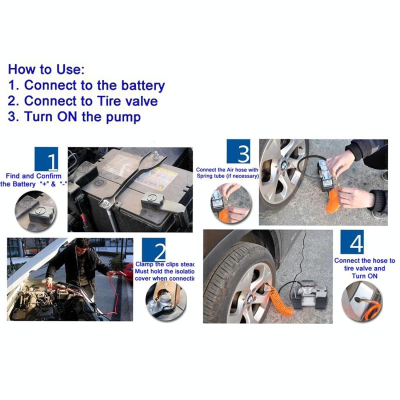 3. 150 PSI mini compressor and fast inflation of tires, rafts and sports equipment by three different nozzle adapters