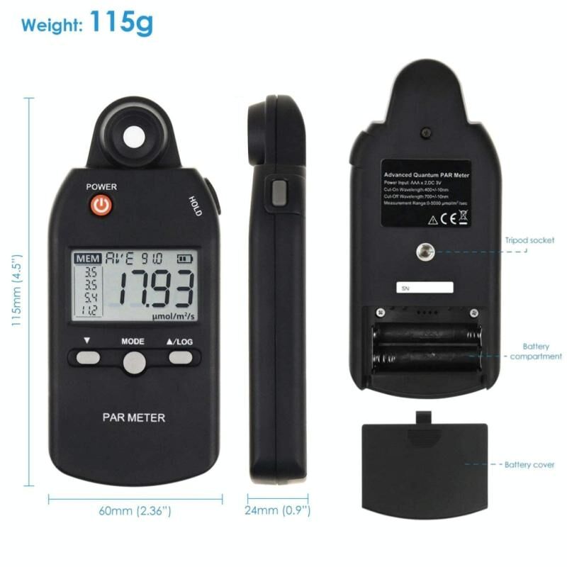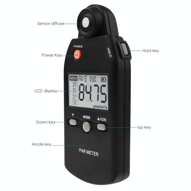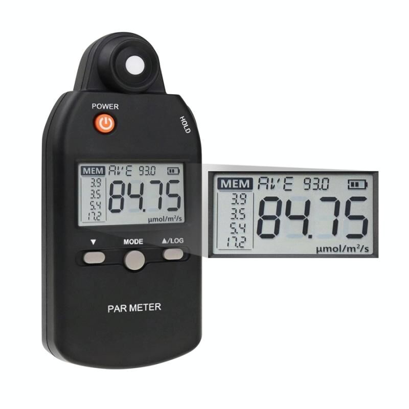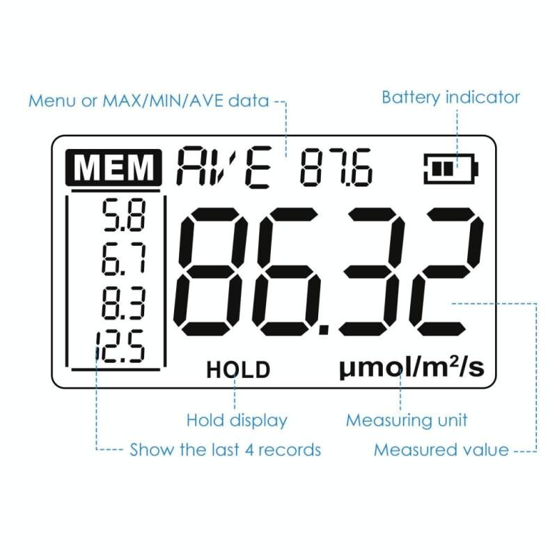 6. Measurement range: 0-5000um ol/m2/second Display Resolution; 0.01 um ol/m2/second (0-99.99); 0.1 um ol/m2/second (100-999): 1 mol/m2/second (1000-5000)