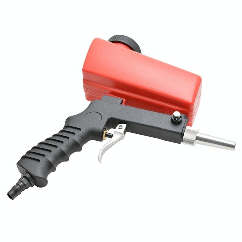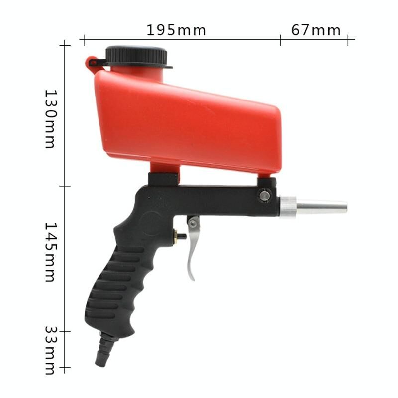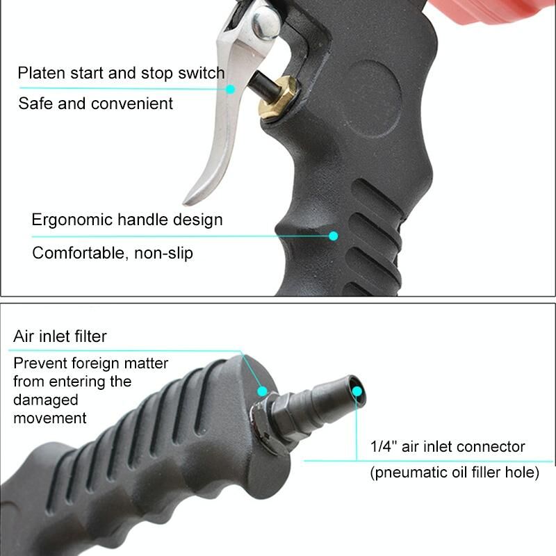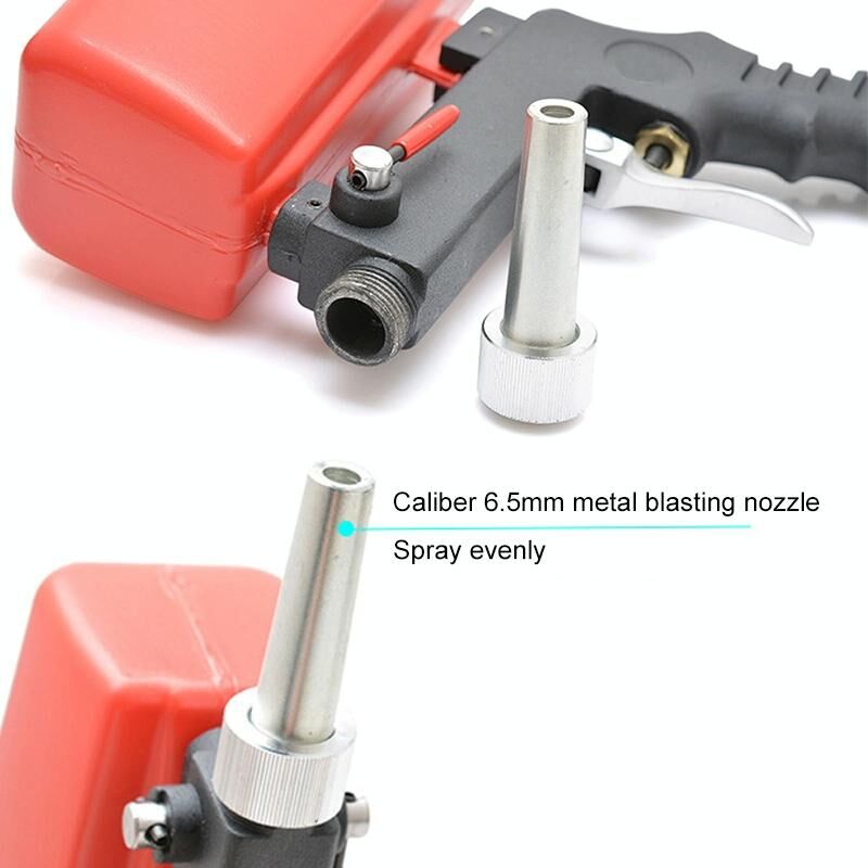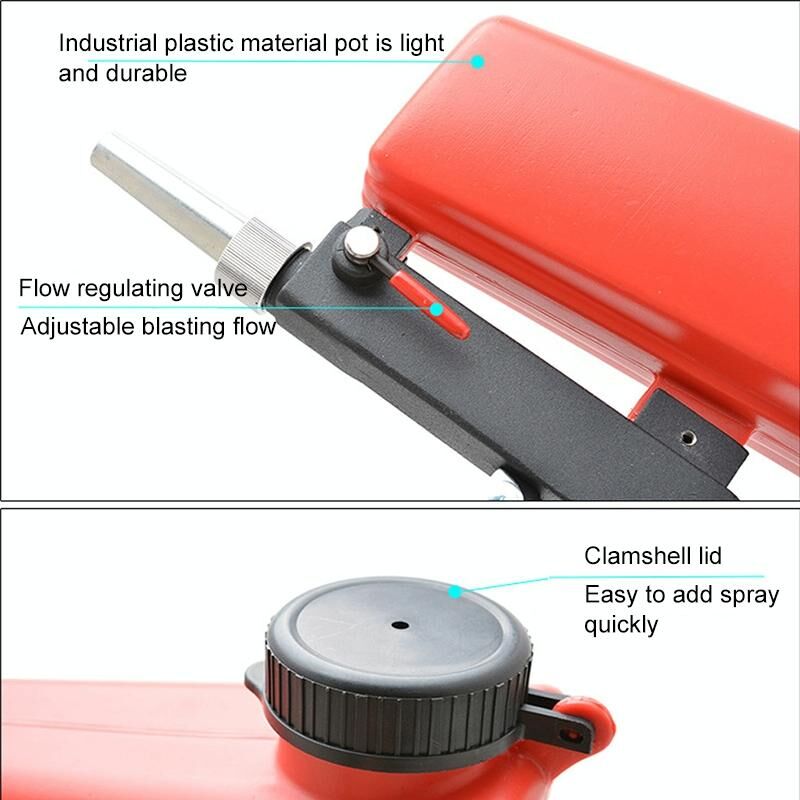 16. Instructions for use: This is suitable for small area sandblasting. Sand is placed in the plastic jar above. The nozzle is used to hold the object to be sprayed, leaving no gap. After sandblasting, the sand leaks into the bag. Then you can pour the sand in the bag into the plastic can, so that it can be recycled.