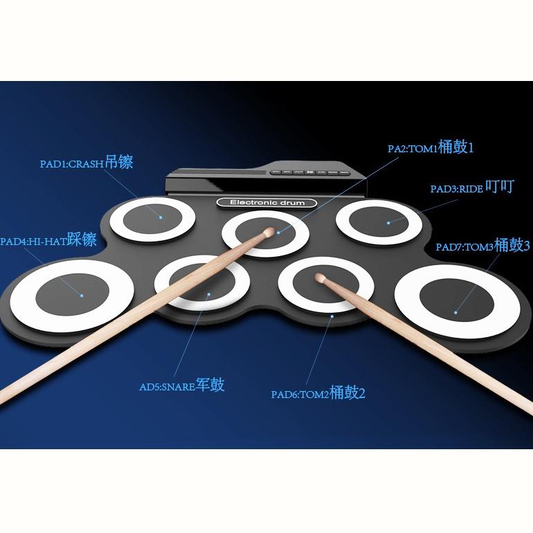 2.With 7 silicon drum pads including Tom/Snare/Hi-Hat/Crash/Ride, making excellent sounds and simulating real beating effect.