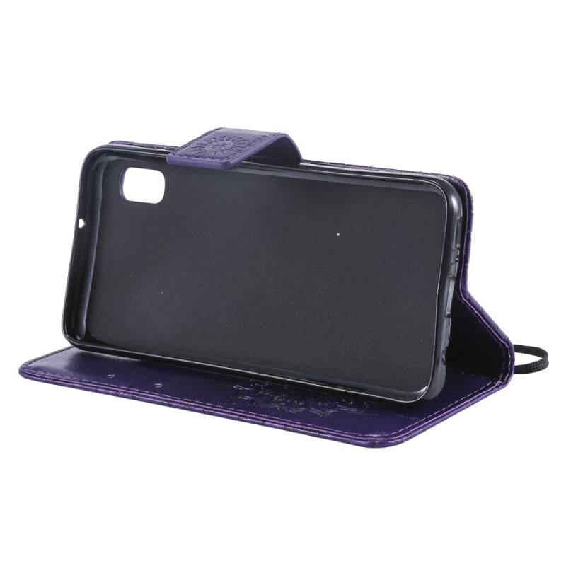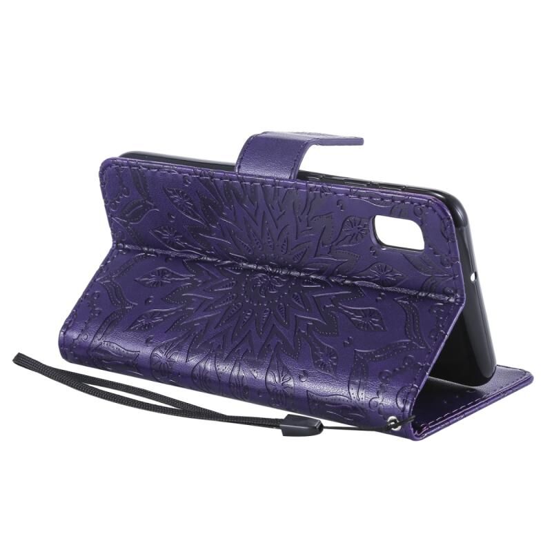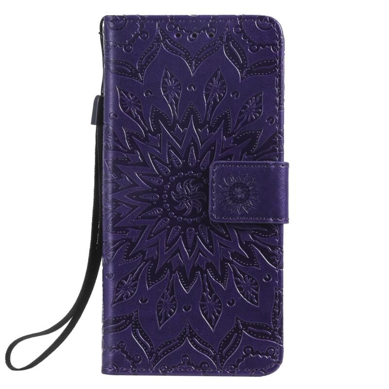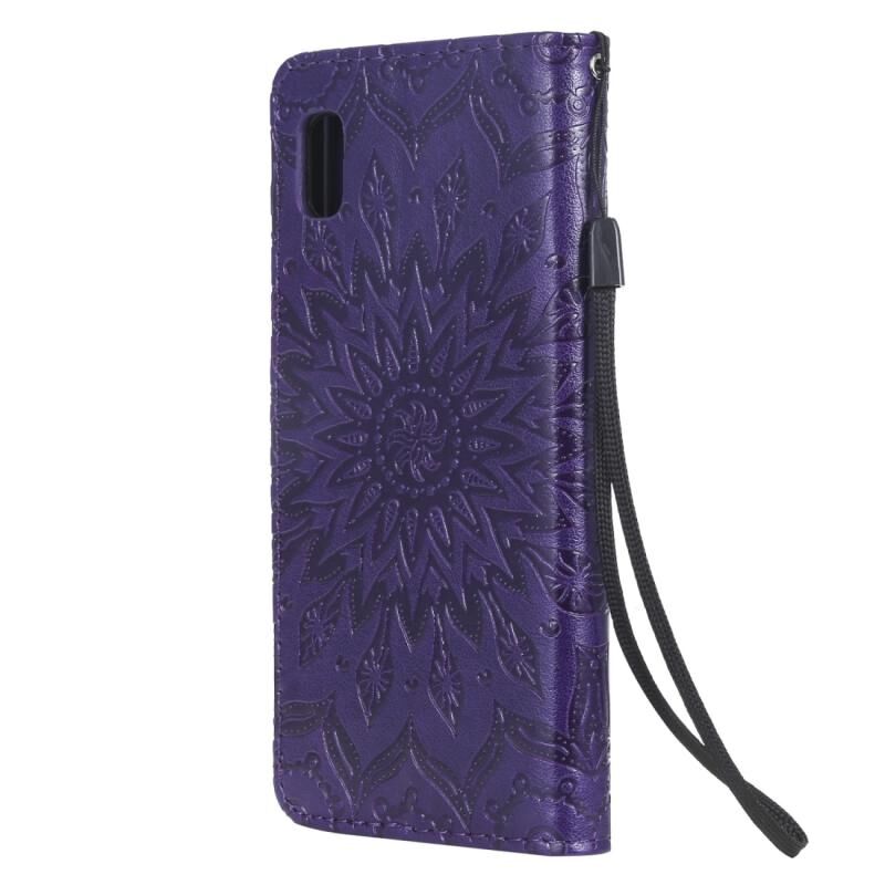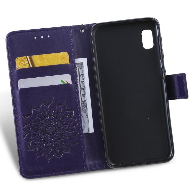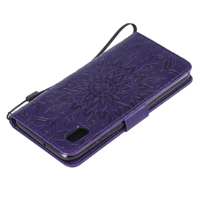 Τυπωμένη εκτύπωση ηλιοτρόπιο μοτίβο οριζόντια Flip PU δέρμα υπόθεση για Galaxy A10e, με θήκη & υποδοχές για κάρτες & πορτοφόλι & κορδόνι (μωβ)