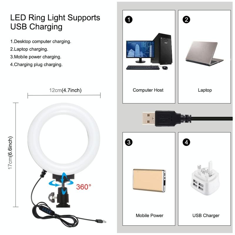 5. The USB ports can be used with multiple devices, such as connect computer host, laptop, mobile power and USB charger. You will be able to enjoy LED ring light at any time free.