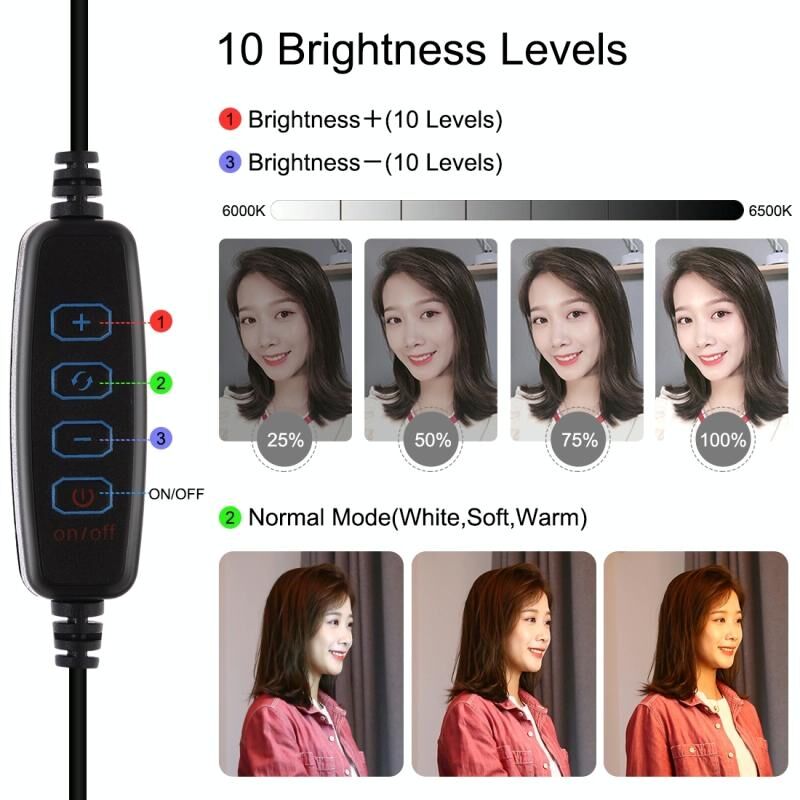 4. 3 colors lighting mode adjustable brightness for your choose,you can adjust the color and brightness very easily, good brightness can be achieved without installing extra colorful filters. Three colors of soft natural light illuminate your beauty in different occasions.