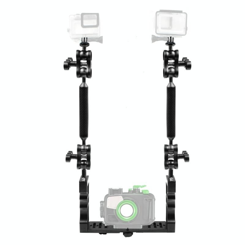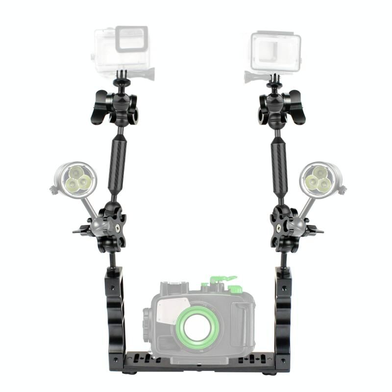 6. This double camera tray is lightweight and will work with almost any camera and video light combination (Some will require an additional adapter). The underwater tray will allow mounting any type of video light.