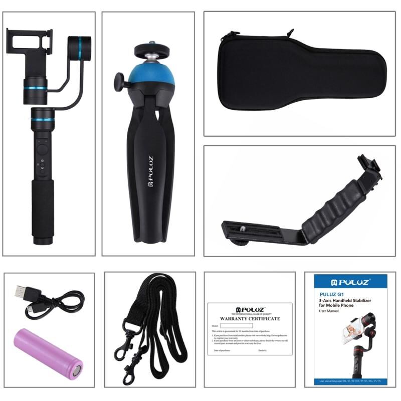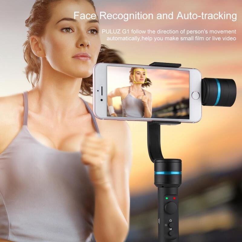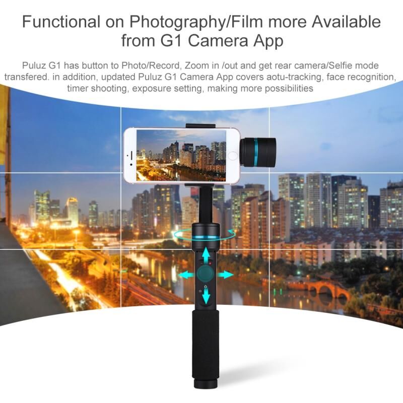 Το Puluz G1 είναι ένα συμπαγές επαγγελματικό έξυπνο gimbal για τηλέφωνα και gopro. Είναι σχεδιασμένο με ένα νέο λειτουργικό σύστημα για να διασφαλίσει ότι είναι εύκολο να εκτελεί ακριβή και γρήγορη σε διαφορετικές θέσεις μεταξύ διαφορετικών τρόπων λειτουργίας, έτσι ώστε να είστε ελεύθεροι από τον έλεγχό του. Το Puluz G1 είναι επίσης ένα σπουδαίο προϊόν που μπορεί να σας φέρει δημιουργικότητα με λειτουργικά κουμπιά για τη φωτογραφία και την ταινία, όπως η φωτογραφία/ηχογράφηση, η μεγέθυνση/σμίκρυνση και η μεταφορά της λειτουργίας οπίσθιας κάμερας/selfie. η δημιουργικότητα προέρχεται επίσης από την αναλώσιμη ενημερωμένη APP (G1 Camera) στο κατάστημα εφαρμογών iOS και Android, με την οποία μπορείτε να κάνετε δυνατή την αυτόματη παρακολούθηση, τη χρονοκαθυστέρηση και την αλλαγή φίλτρου. Το μέγιστο ωφέλιμο φορτίο των 220g σας υποστηρίζει να συνδέσετε φακούς ποικιλομορφίας με διαφορετική εστιακή απόσταση, είδη φωτισμού πλήρωσης και πολλά άλλα φωτογραφικά/κινηματογραφικά εργαλεία ανά πάσα στιγμή και οπουδήποτε. Εκτός αυτού, είναι κατασκευασμένο από υψηλής ποιότητας υλικό από κράμα αλουμινίου αεροπορίας, το οποίο έχει καλή εμφάνιση και αίσθηση αφής. Η διάρκεια λειτουργίας είναι έως και 6 ώρες και είναι διαθέσιμη για να έχετε φόρτιση κινητού σε πραγματικό χρόνο. Είναι πραγματικά πολύτιμο στην τιμή του