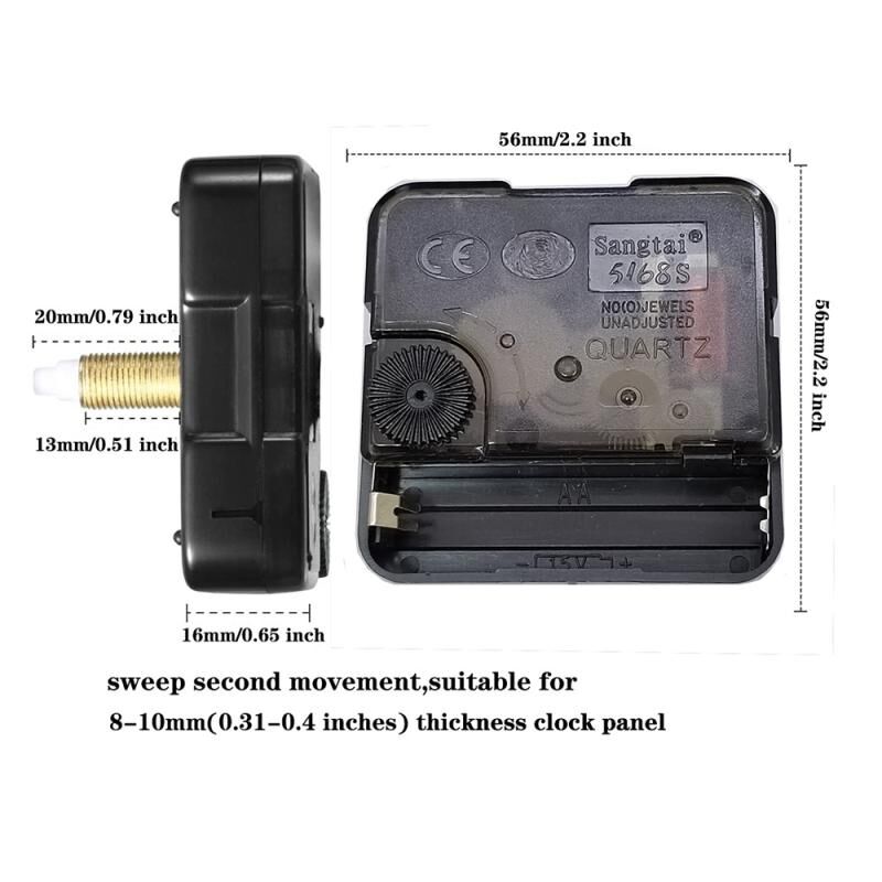 4. Movement size: total shaft length: 20mm/0.78 inch, thread height: 13mm/0.51 inch, suitable for clock panels with panel thickness of 8-10mm (0.31-0.4 inch).