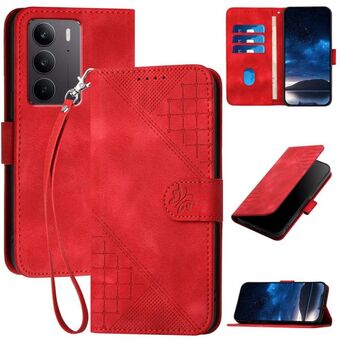 For Realme C75 Global Grid Butterfly Embossed Pattern Leather Phone Case with Lanyard(Red)