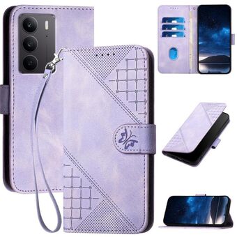 For Realme C75 Global Grid Butterfly Embossed Pattern Leather Phone Case with Lanyard(Light Purple)