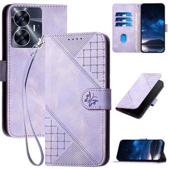 For Realme C55 4G Global Grid Butterfly Embossed Pattern Leather Phone Case with Lanyard(Light Purple)