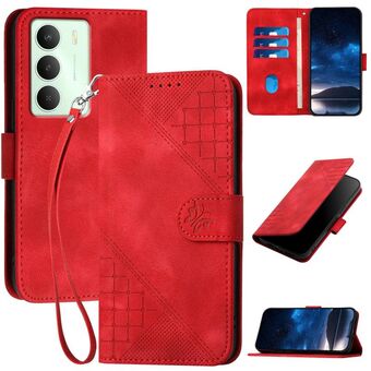 For Realme 14x Global Grid Butterfly Embossed Pattern Leather Phone Case with Lanyard(Red)