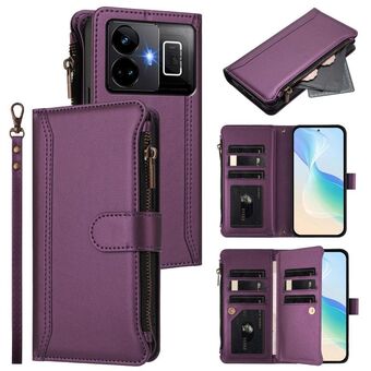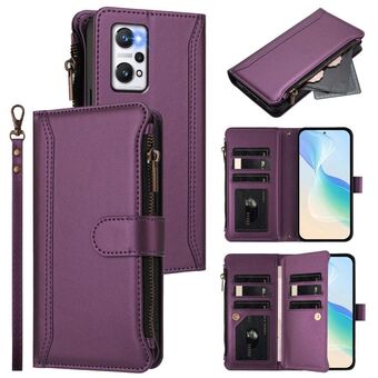 For Realme GT NEO 3T Magnetic Closure 9 Card Slots Zipper Leather Case with Hand Strap(Purple)