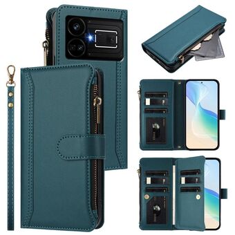 For Realme GT5 240W / GT5 5G Magnetic Closure 9 Card Slots Zipper Leather Case with Hand Strap(Turquoise)