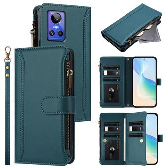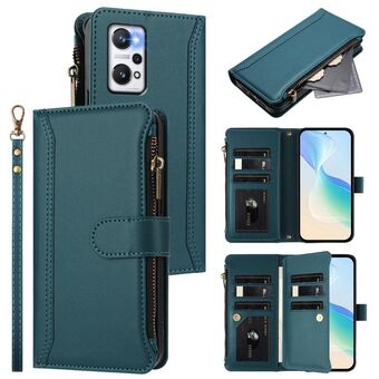 For Realme GT NEO 3T Magnetic Closure 9 Card Slots Zipper Leather Case with Hand Strap(Dark Green)