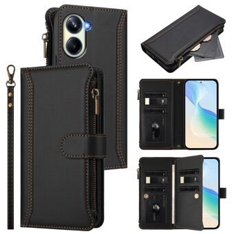 For Realme 10 4G Global Magnetic Closure 9 Card Slots Zipper Leather Case with Hand Strap(Black)