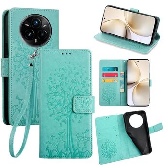 For Realme 14 Pro 5G Global Tree & Deer Embossed Leather Phone Case(Green)