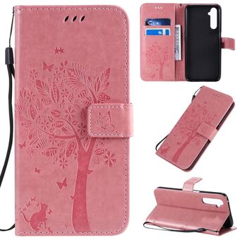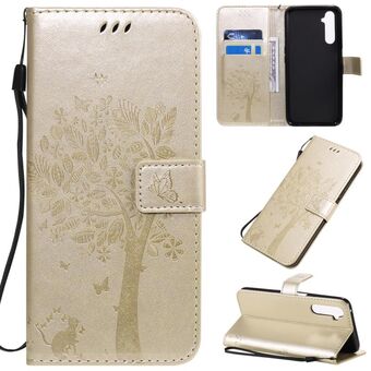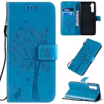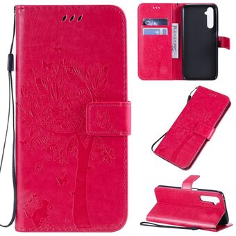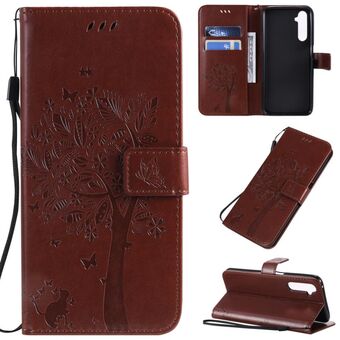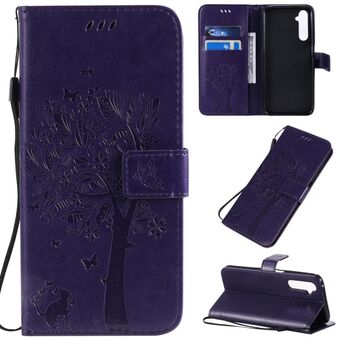 Θήκη για OPPO Realme 6 Pro με σχέδιο Δέντρου & Γάτας, εκτυπωμένη με θερμοτύπωση, οριζόντια αναδιπλούμενη από δερματίνη PU με βάση στήριξης & θήκες καρτών & πορτοφόλι & κορδόνι (Μωβ)