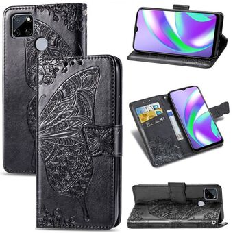 Θήκη δέρματος οριζόντιας αναδίπλωσης για OPPO Realme C12 με σχέδιο πεταλούδας, λουλουδιών, ανάγλυφο, με βάση στήριξης, θήκες καρτών, πορτοφόλι & λουρί (Μαύρο)