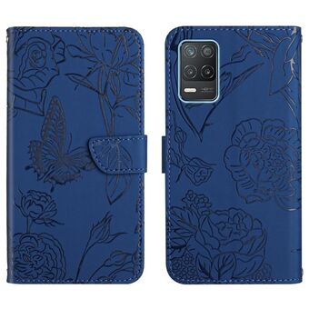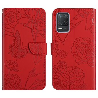 Θήκη τηλεφώνου από δέρμα με ανάγλυφο σχέδιο πεταλούδας και παιώνιας, αίσθηση δέρματος για OPPO Realme 8 5G / V13 5G (Κόκκινο)