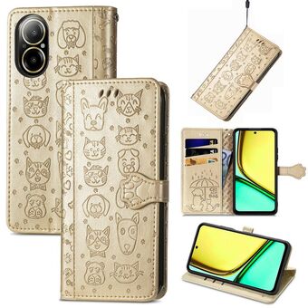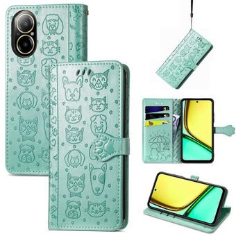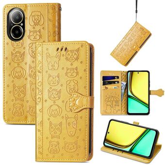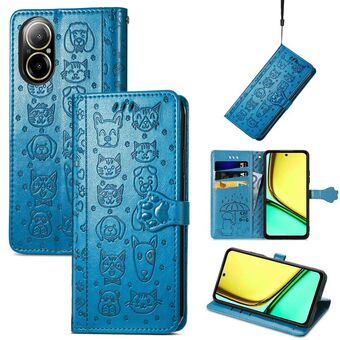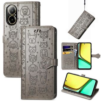 Θήκη τηλεφώνου δερμάτινη ανάγλυφη με σχέδια γάτας και σκύλου για Realme C67 4G (Γκρι)