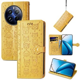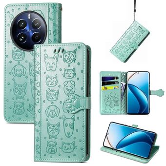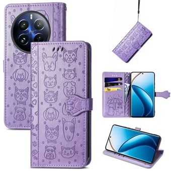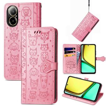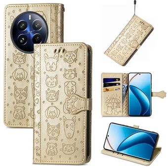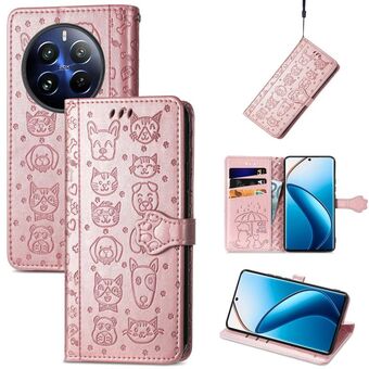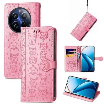 Θήκη τηλεφώνου από δέρμα με ανάγλυφο σχέδιο γάτας και σκύλου για Realme 12 Pro (Χρυσορόδινο)