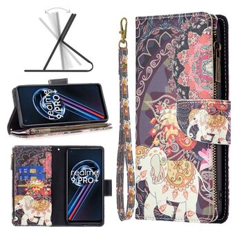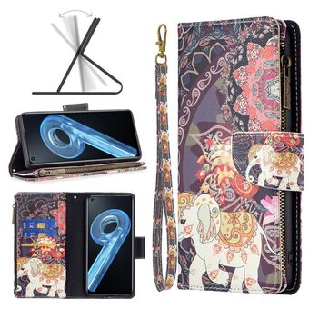 Θήκη τηλεφώνου από δέρμα με φερμουάρ και πολύχρωμο σχέδιο για OPPO Realme 9 Pro+ (Λουλούδια και Ελέφαντες)