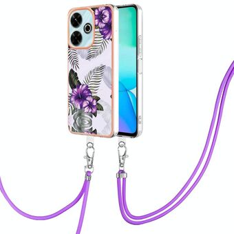 For Redmi 13 4G Electroplating Pattern IMD TPU Shockproof Case with Neck Lanyard(Purple Flower)
