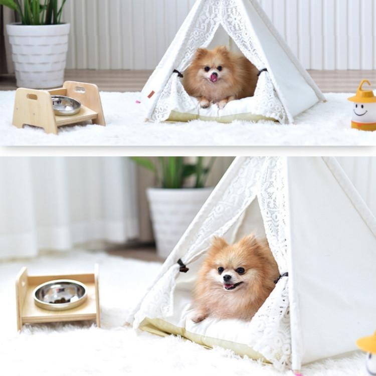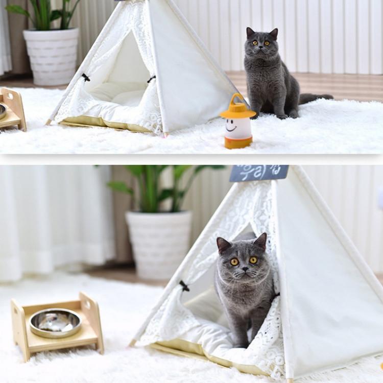 Αφαιρούμενη πλενόμενη φωλιά/σκηνή κατοικίδιου, 60x60x70cm, με δαντέλα και μαξιλάρι.