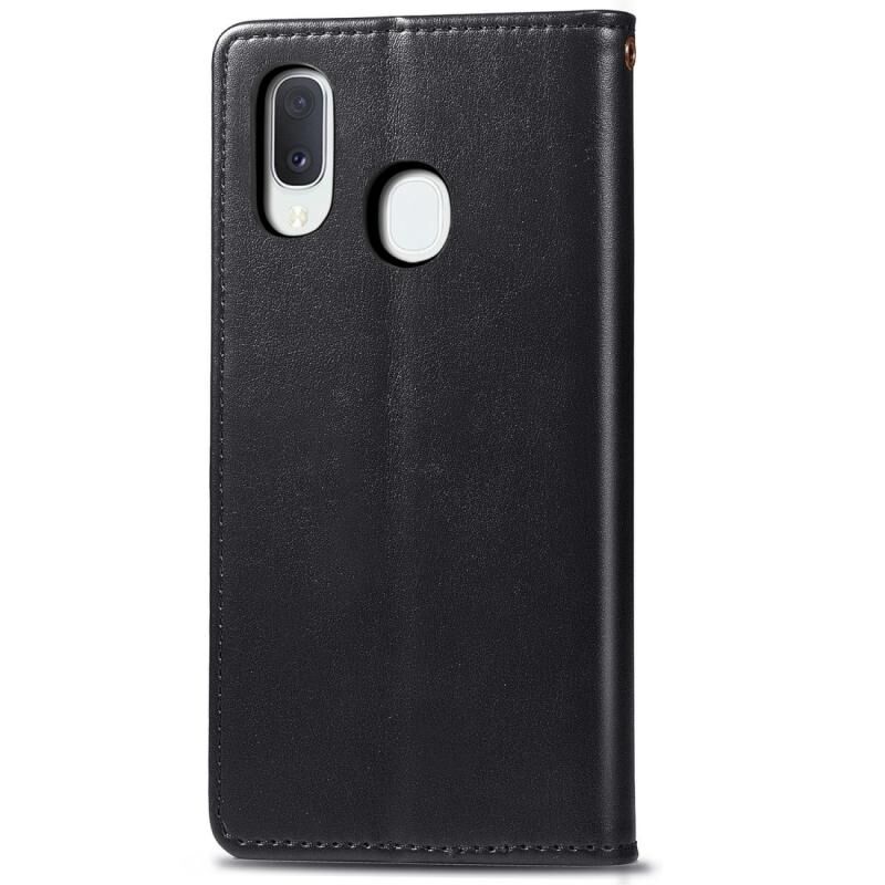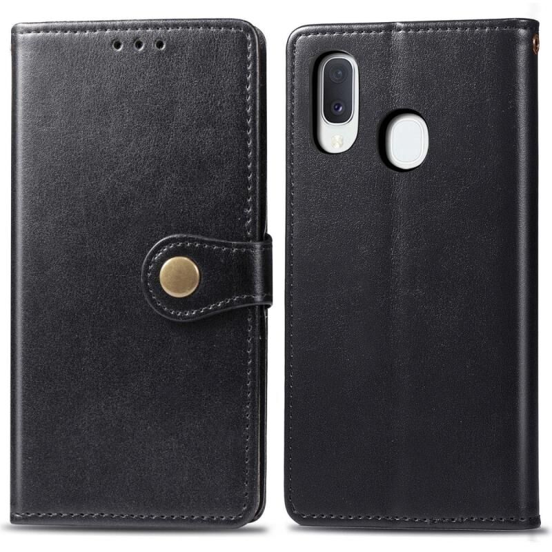 Ρετρό αμιγές χρώμα δερμάτινη πόρπη προστασίας κινητού τηλεφώνου δερμάτινη θήκη με κορδόνι & πλαίσιο φωτογραφιών & υποδοχή κάρτας & πορτοφόλι & λειτουργία βραχίονα για Galaxy A20e (μαύρο)