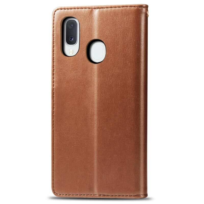 Ρετρό αμιγές χρώμα δερμάτινη πόρπη προστασίας κινητού τηλεφώνου δερμάτινη θήκη με κορδόνι & πλαίσιο φωτογραφιών & υποδοχή κάρτας & πορτοφόλι & λειτουργία βραχίονα για Galaxy A20e (καφέ)