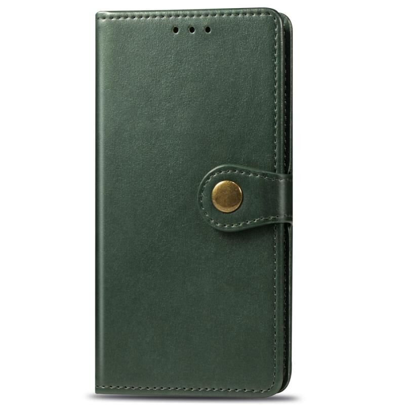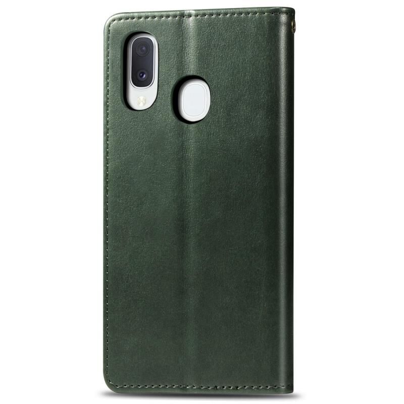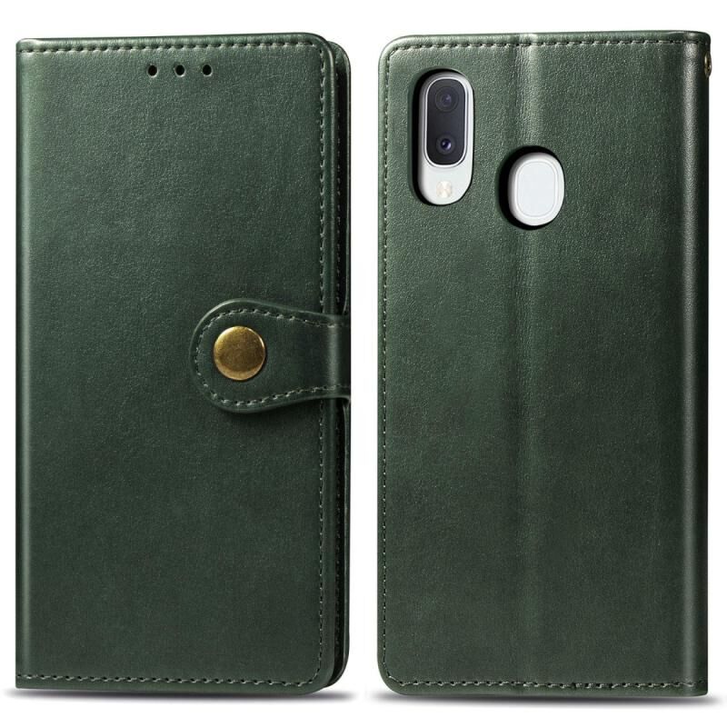 Ρετρό αμιγές χρώμα δερμάτινη πόρπη προστασίας κινητού τηλεφώνου δερμάτινη θήκη με κορδόνι & πλαίσιο φωτογραφιών & υποδοχή κάρτας & πορτοφόλι & λειτουργία βραχίονα για Galaxy A20e (πράσινο)