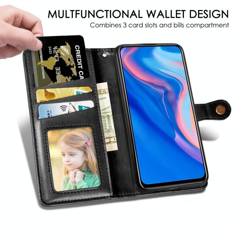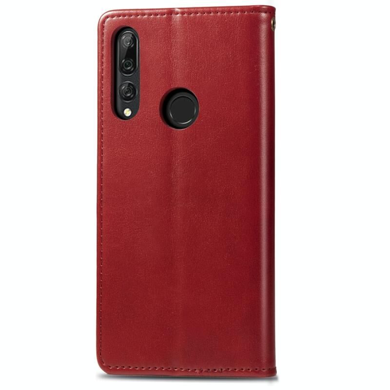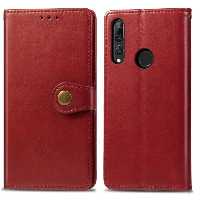 Ρετρό αμιγές χρώμα δερμάτινη πόρπη προστασίας κινητού τηλεφώνου δερμάτινη θήκη με κορδόνι & πλαίσιο φωτογραφιών & υποδοχή κάρτας & πορτοφόλι & λειτουργία βραχίονα για Huawei Y9 Prime 2019 (κόκκινο)