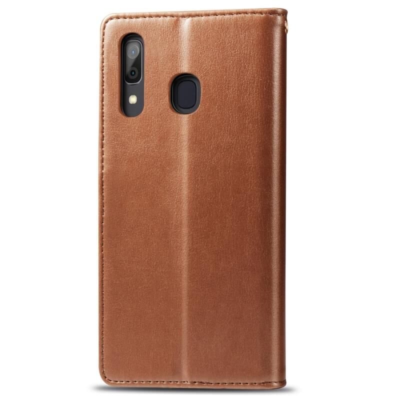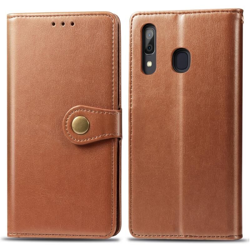 Ρετρό Αμιγές χρώμα δερμάτινη αγκράφα κινητού τηλεφώνου προστασία δερμάτινη θήκη με πλαίσιο φωτογραφιών & υποδοχή κάρτας & πορτοφόλι & λειτουργία βραχίονα για Galaxy A20 / A30 (καφέ)