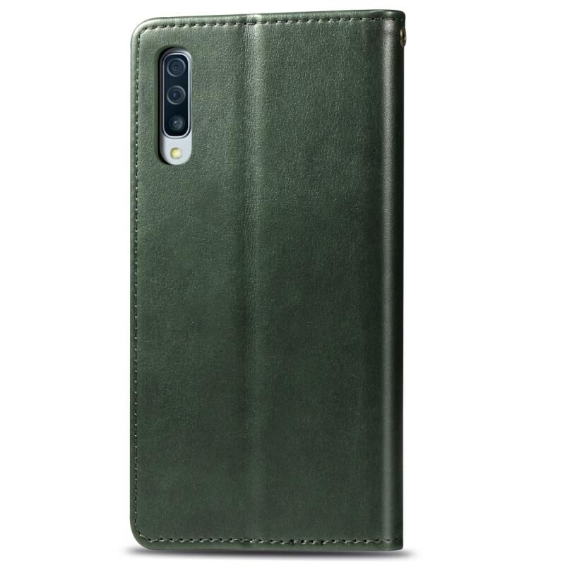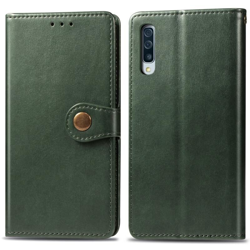 Ρετρό στερεό χρώμα δέρμα αγκράφα κινητό τηλέφωνο προστασία δερμάτινη θήκη με πλαίσιο φωτογραφιών & υποδοχή κάρτας & πορτοφόλι & λειτουργία βραχίονα για Galaxy A50 (πράσινο)