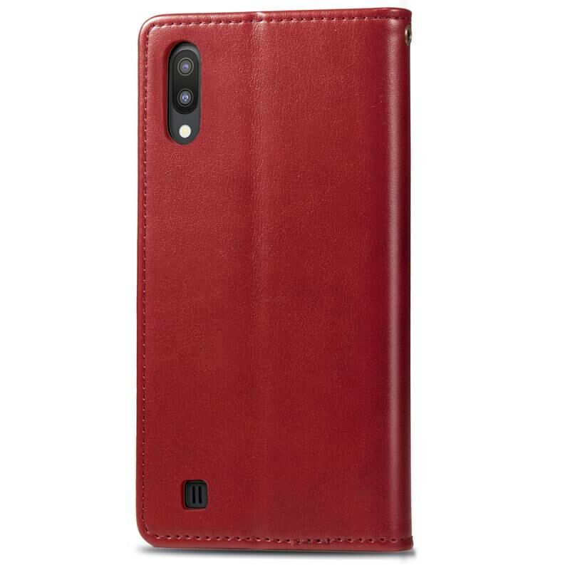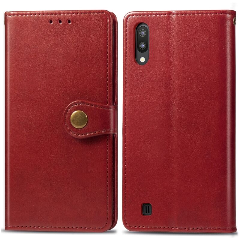 Ρετρό Αμιγές χρώμα δερμάτινη αγκράφα κινητού τηλεφώνου προστασία δερμάτινη θήκη με πλαίσιο φωτογραφιών & υποδοχή κάρτας & πορτοφόλι & λειτουργία βραχίονα για Galaxy M10 (κόκκινο)