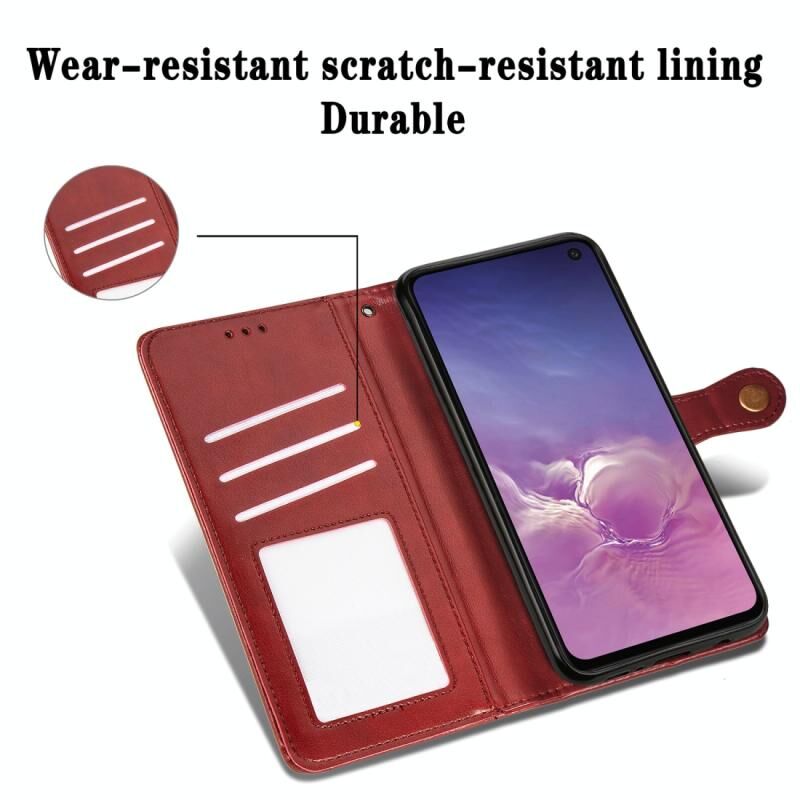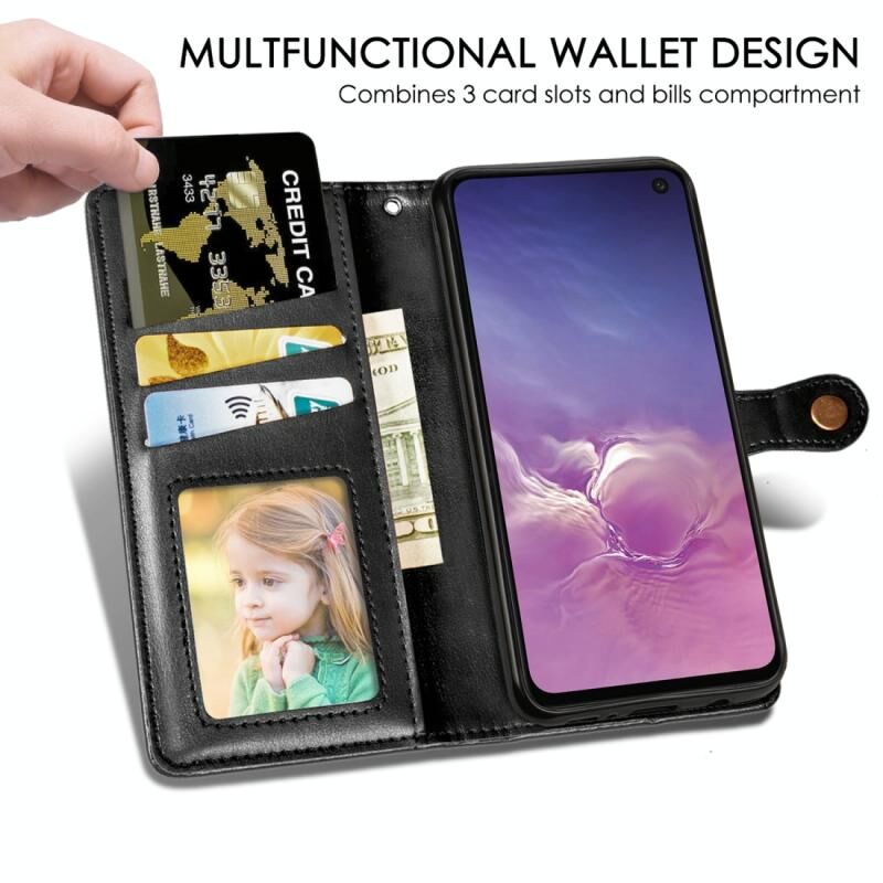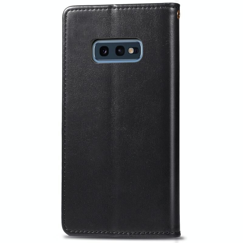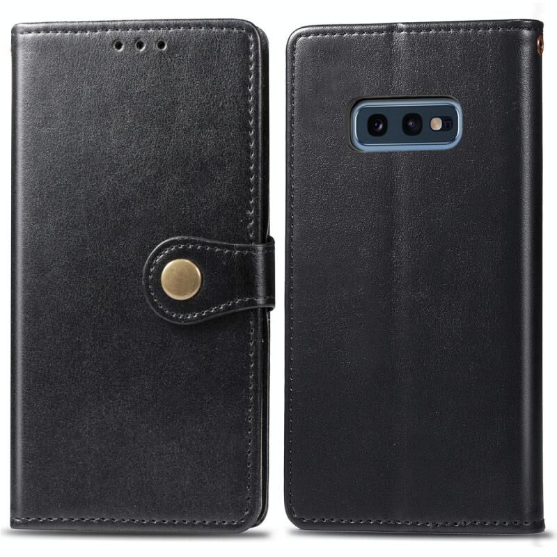 Ρετρό Αμιγές χρώμα δερμάτινη πόρπη προστασίας κινητού τηλεφώνου δερμάτινη θήκη με πλαίσιο φωτογραφιών & υποδοχή κάρτας & πορτοφόλι & λειτουργία βραχίονα για Galaxy S10e (μαύρο)