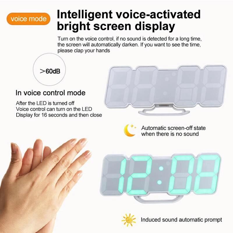 1. This product includes: clock, date, alarm, weekend alarm, snooze, voice control, temperature, humidity, and countdown function.